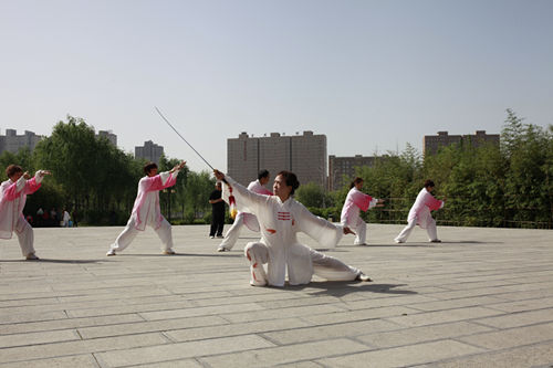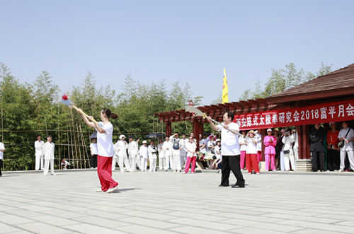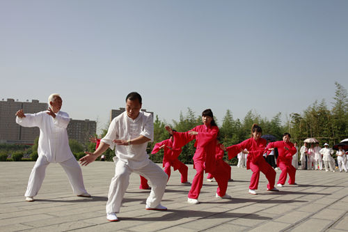 随后上场的是省体辅导站的春秋大刀和集体表演的36式普及架。张耀东和尹二梅夫妇俩的关公春秋大刀配合默契,夫唱妇随,赢得一片叫好声。由白旭胡艳红张改萍领衔的30人的表演队伍在烈日下精神抖擞展现出了总站人员能打硬仗的顽强作风。看到队员们汗流满面的场景,研究会副会长杨新平感慨的说:这才能练出真功夫。