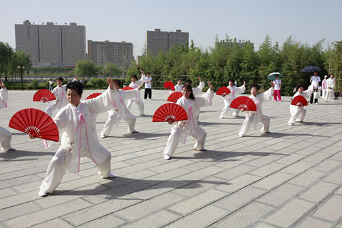 首先上场表演的是富平一队崔宝珍领衔的太极功夫扇,统一的服装整齐划一的动作,看得出她们是做了精心彩排的,尤其是扇子的开合运劲绝非一日之功。