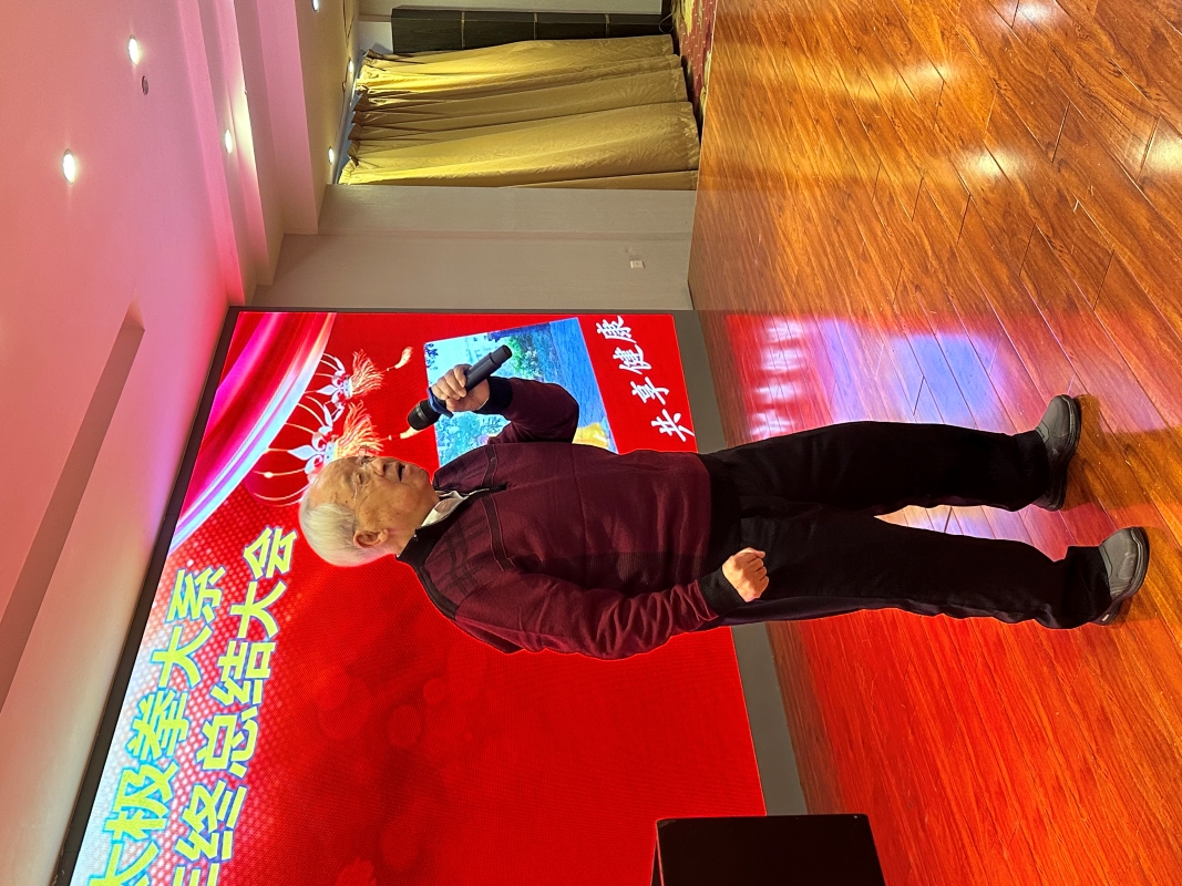 99岁高龄的陈氏太极拳大师陈全忠老会长底气十足声如洪钟的讲话:非常高兴的见到这么多来自全国各地的太极拳爱好者,我们大家能够团结起来战胜三年疫情,今年第一次在这里召开太极拳年会,大家高兴吗?(台下掌声雷动),这次活动搞的非常好,一点不乱,我看了节目单有了新的认识,陈氏太极拳在陕西卧虎藏龙,发展了很快,尤其是我这个年龄看到如此的大好局面,真是难得;我们练太极拳都有一个共同的心愿,就是为了身体更加健康,有了健康,才会心想事成,为社会多做点有益的贡献;把咱们太极拳更好更快的推向世界;不但我们身体健康了,还把健康推向社会,这也是我们太极拳爱好者的共同的心愿;对于参加年会的人有了一个更好更高的要求,就是大家团结起来把咱们陕西陈氏太极拳的拳艺怎样的提高,把身体锻炼的更好,这是我们研究会最终的目的;我想讲的太多了,我只是要强调一点,练太极拳就是以调息,以气为主,一切动作都是为了气息,不管你是练拳时间的长短,都要记住这5个字:松柔沉圆活;把这几个字好好去研究,你才会得到真正的健康;今天我们送走了2023年,迎接2024年的新年到来,让我们做好迎接更好更大更快的太极拳发展高潮的到来;最后,祝大家身体健康家庭和睦,谢谢大家!